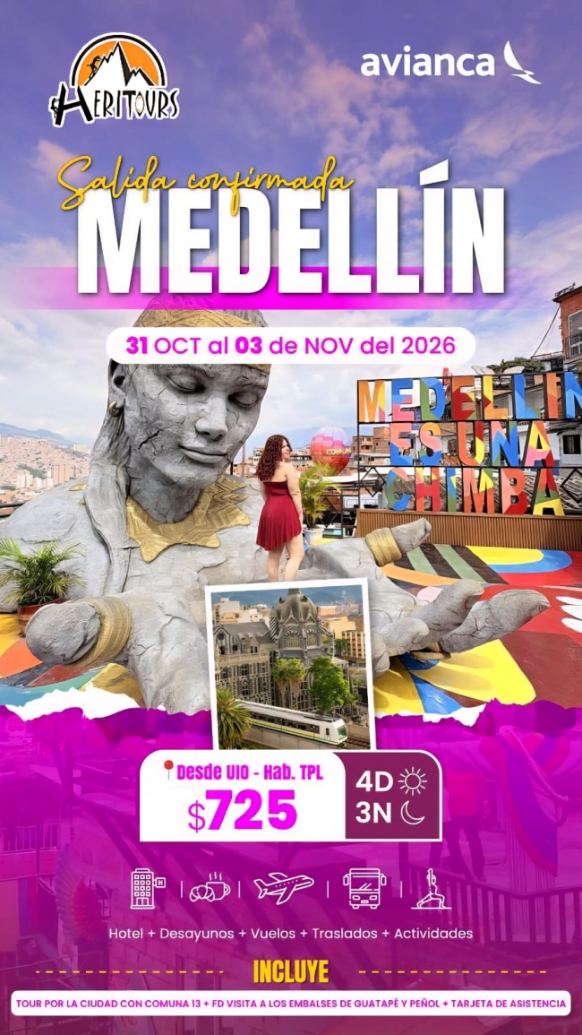 ▪ Boleto aéreo UIO – MDE – BOG – UIO vía Avianca Airlines (equipaje con maleta de mano de 10 kg y equipaje en bodega de 23kg)